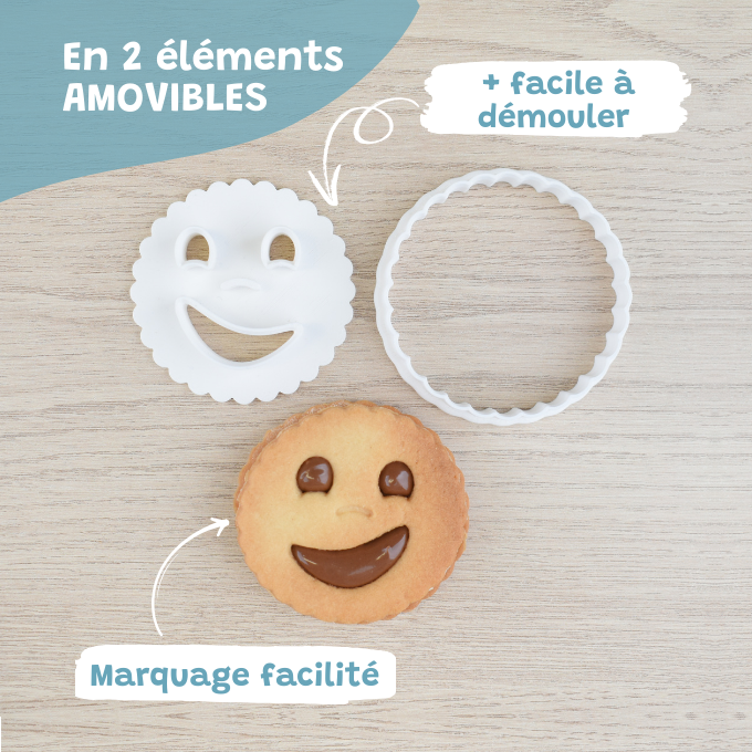 Our cookie cutters are made up of removable elements that make it easier to mark the back of the cookie as well as the smile and eyes on the dough.