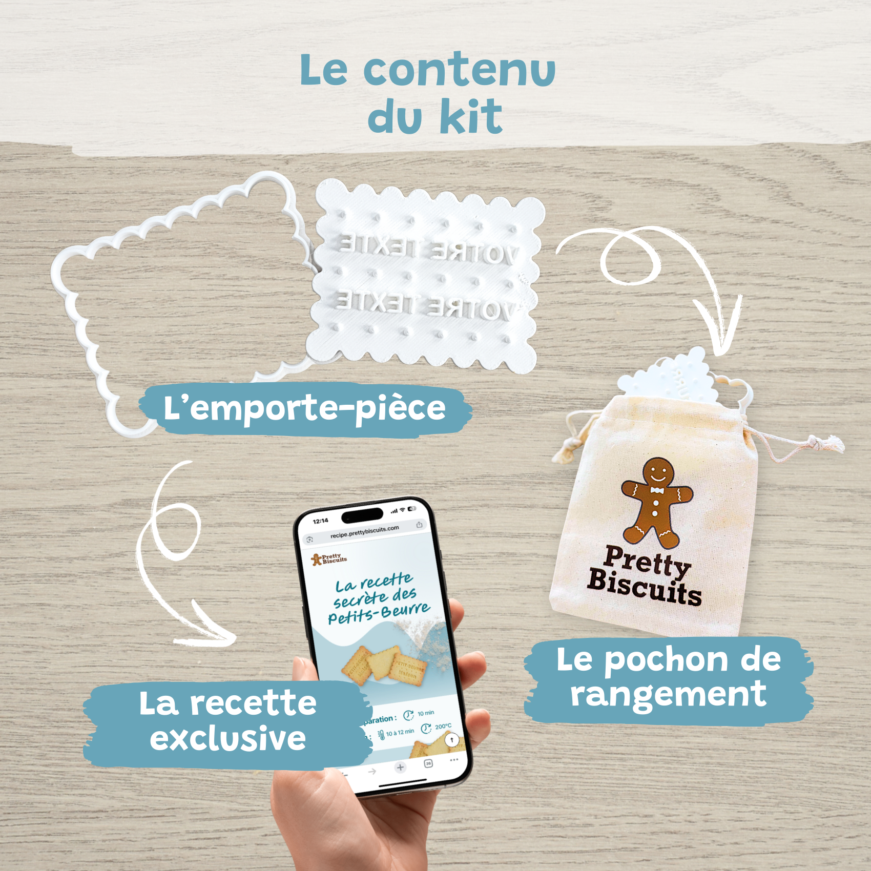 Découvrez votre emporte-pièce personnalisé Pretty Biscuits rangé dans son joli pochon. Il sera accompagné de la recette digitalisée du Petit-beurre Pretty Biscuit.